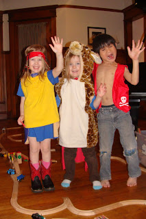 So, L.'s outfit in this picture includes: 1 superman costume (the blue underneath), 1 blue cape with gold lining (her Christmas present that I made her... you can see it peeking out below the shorts),1 yellow tank top from the seasonally inappropriate collection, 1 pair of pink socks, 1 pair of red cowboy boots, and 1 Captain Jack Sparrow pirate headband. It's a look. K. completes the trio with his version of a pirate costume, complete with underwear elastic showing. That's probably more a commentary on my inability to find pants that are long enough but also narrow enough than it is on his sartorial sensibilities, though.