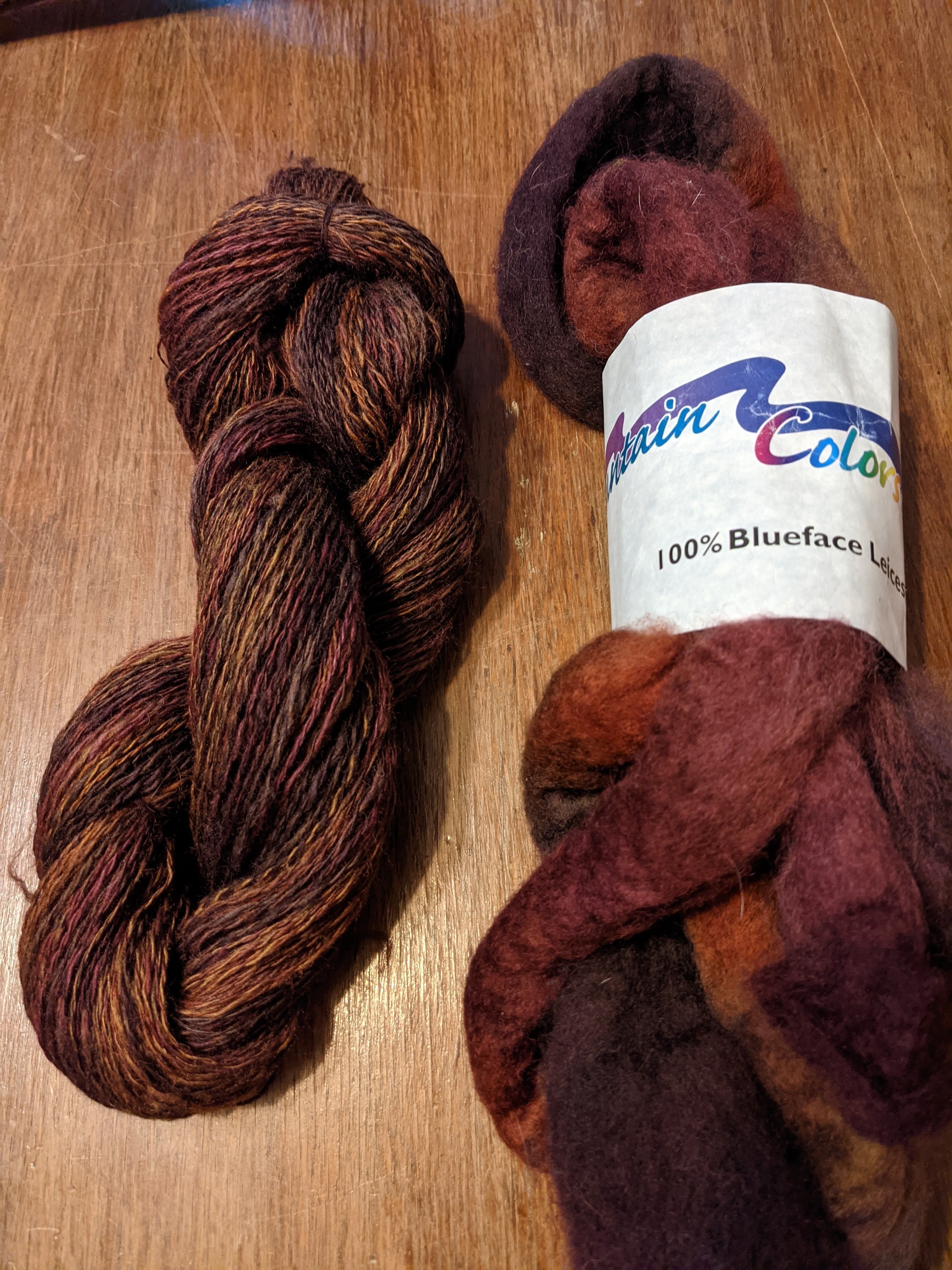 One of the things which fascinates me about spinning is seeing what the yarn looks like when it's all done. You really can't tell until you have it in a skein at the very end to see what you have. You can have a general sense in the middle of a project, but not completely. To give you sense of that, I took some pictures. Here is the wool top that I have been using. This is what was going to be the third single in the initially planned 3-ply.